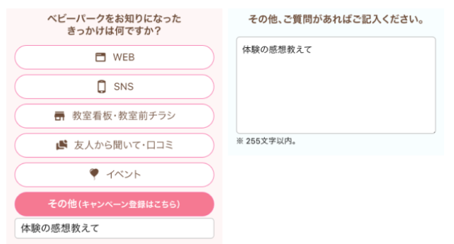 まず無料体験申込フォームの「ベビーパークをお知りになったきっかけは?」もしくは「その他・ご質問」欄に「体験の感想教えて」と入力して、体験レッスンに申込みます。