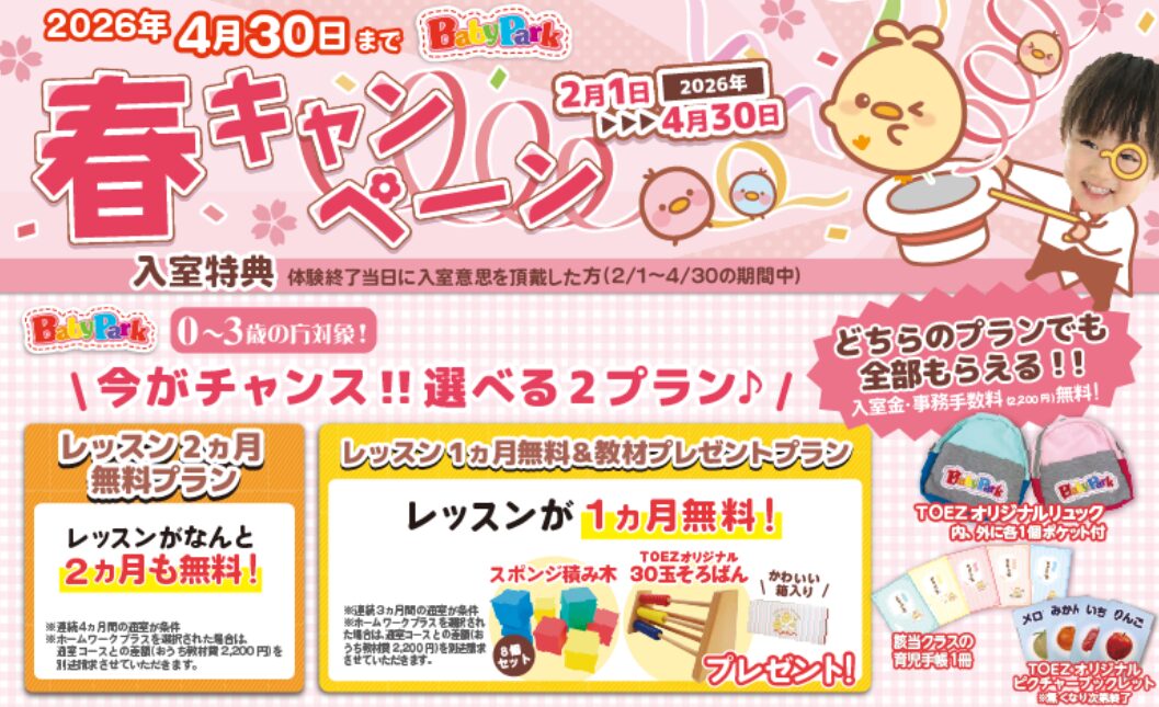 | 春キャンペーン(4/30まで) | ![]() 詳細はこちら>>親子教室ベビーパークキャンペーン |