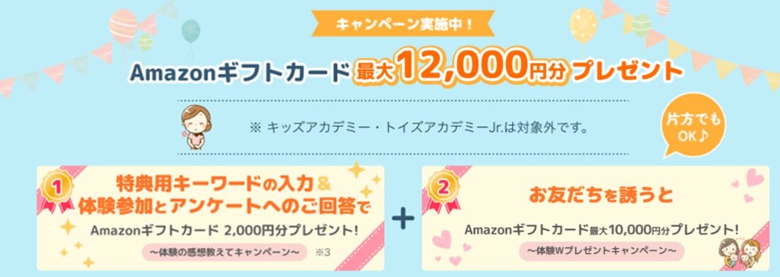 【公式サイト企画】Amazonギフトカード最大12,000円分プレゼント!! | ![]() 詳細はこちら>>親子教室ベビーパークキャンペーン |