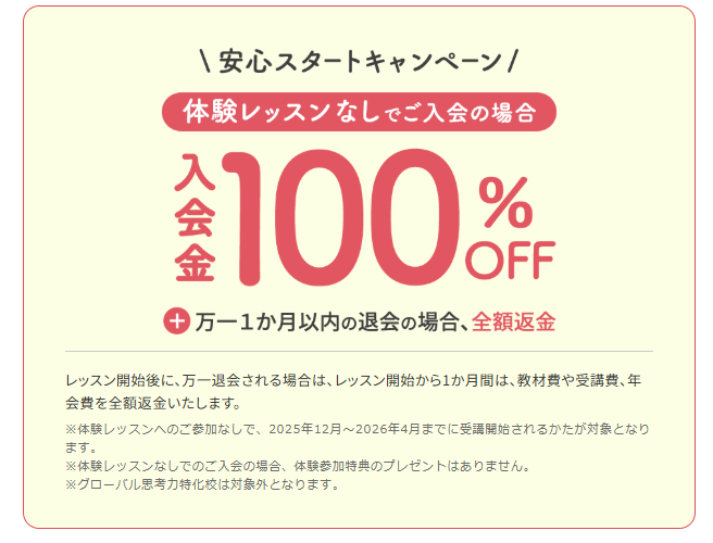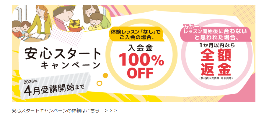 入会金無料や特典プレゼント、全額返金保証など、家庭の負担を軽減する内容が充実しています。