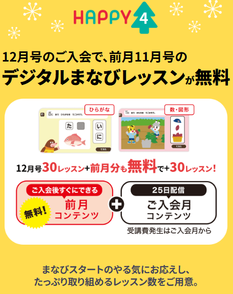 ※デジタルコンテンツのみが対象です。キッズワークやエデュトイなどのお届けはございません。また、一部のデジタルコンテンツはご利用いただけない場合があります。