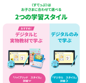 ちなみに余談ですが、今は「ハイブリッドスタイル」「デジタルスタイル」の2種類ですが、以前はタブレットを使ったコースは「じゃんぷタッチ」「すてっぷタッチ」という呼称でした。それ以外は紙とエディトイ中心コースがありました。