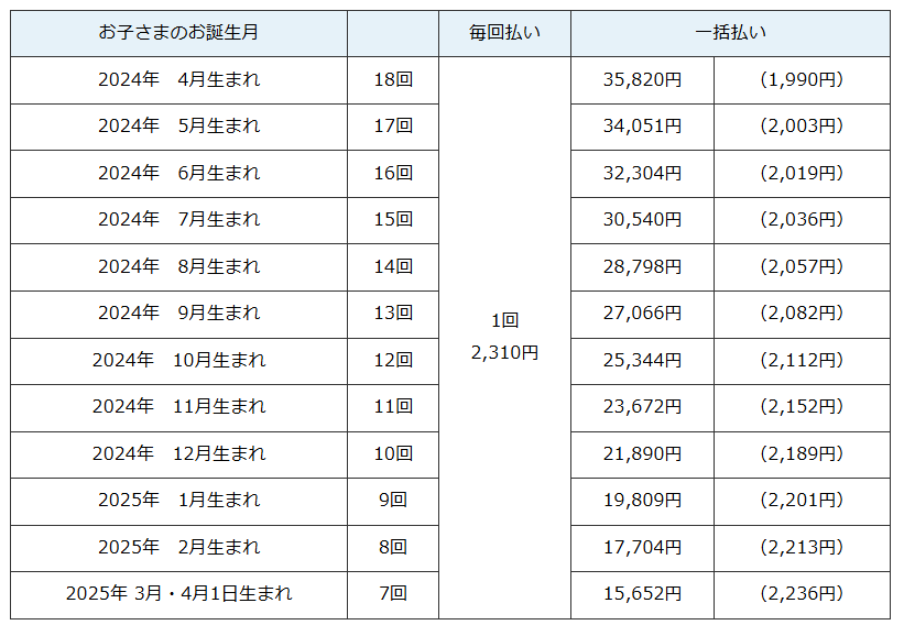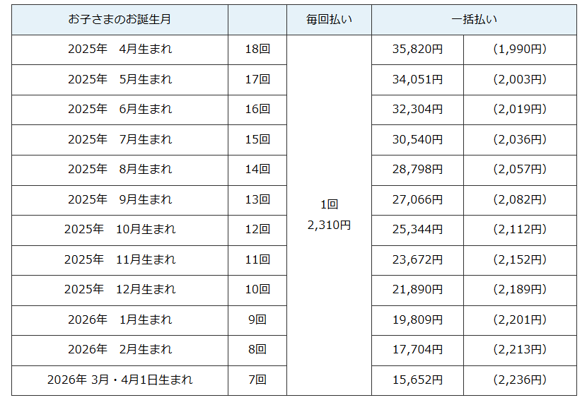 ベビーは生まれ月によって受講回数が変わるため一括払いの金額は一律でありません。