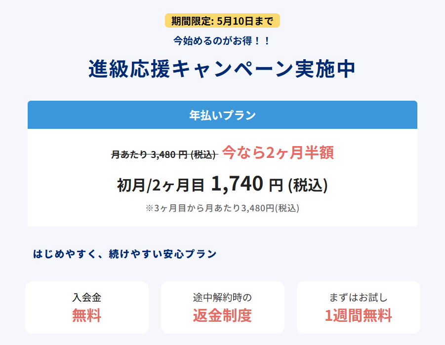 進学応援キャンペーン2ヶ月半額!!(5/10まで)
