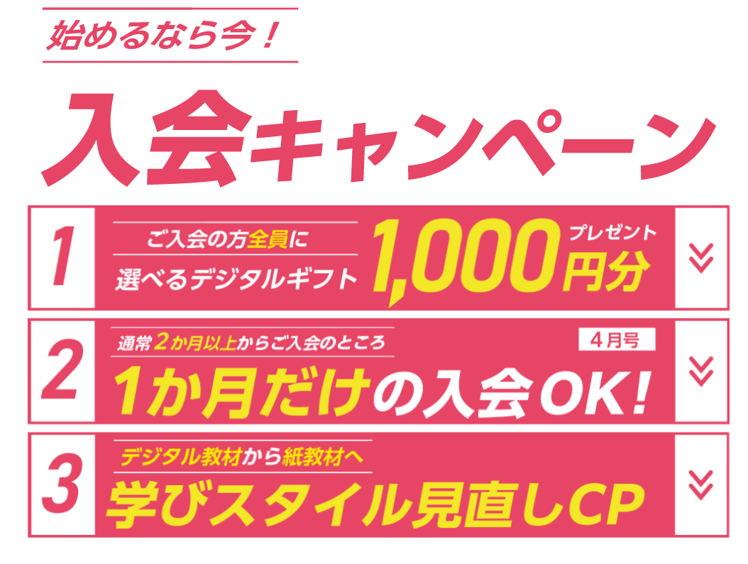 その代わり、1ヶ月だけお試しキャンペーンや特別な教材がもらえるキャンペーンを実施することがあるので、そのキャンペーン時期に申し込むことが一番お得に入会できます。