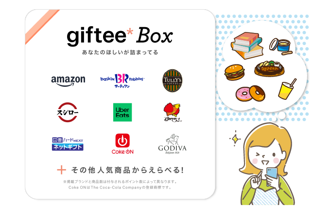 ・giftee Boxは、豊富なラインナップの中から好きな商品を選べるデジタルギフトです。giftee Box内で交換できる商品等は予告なく変更になる場合がございます。