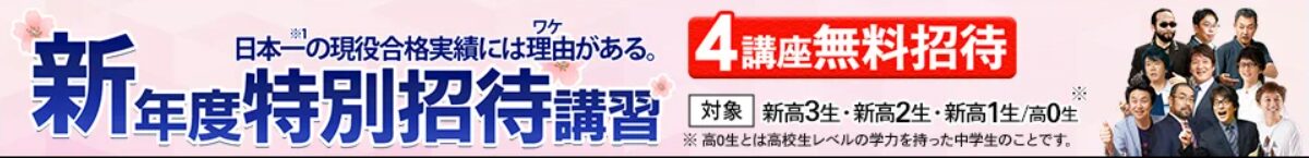| 受講資格 | 志望校合格を目指して学習に取り組む、意欲ある 新高3生・新高2生・新高1生(東進生でない方)/高0生 高0生とは、高校生レベルの学力を持つ意欲ある中学生。 |